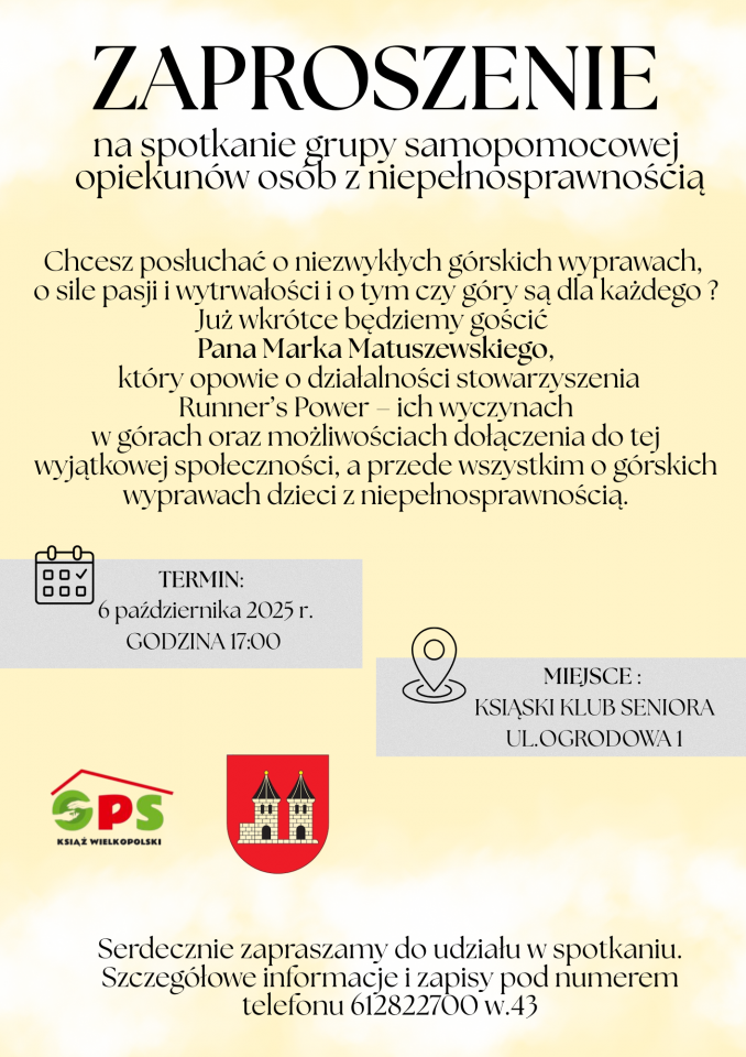 Ośrodek Pomocy Społecznej w Książu Wlkp., zaprasza na kolejne spotkanie grupy samopomocowe, które odbędzie się 6 października 2025 roku o godzinie 17.00, w Ksiąskim Klubie Seniora. Naszym gościem będzie Pan Marek Matuszewski - pomysłodawca i koordynator projektu Runner's Power - spełniamy górskie marzenia, w ramach którego dzieci z niepełnosprawnościami zdobywają prawdziwe górskie szczyty ze swoimi rodzicami, opiekunami i wolontariuszami.