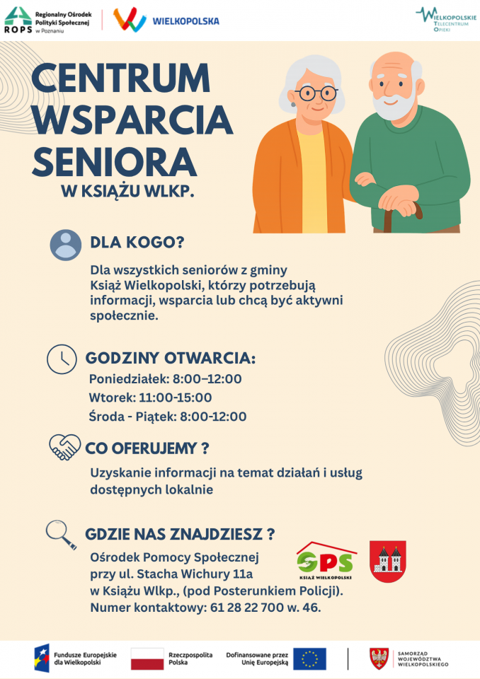 W ramach projektu „Wielkopolskie Telecentrum Opieki” w maju 2025 roku rozpocznie swoją działalność Centrum Wsparcia Seniora. Centrum funkcjonować będzie w strukturach Ośrodka Pomocy Społecznej w Książu Wielkopolskim.