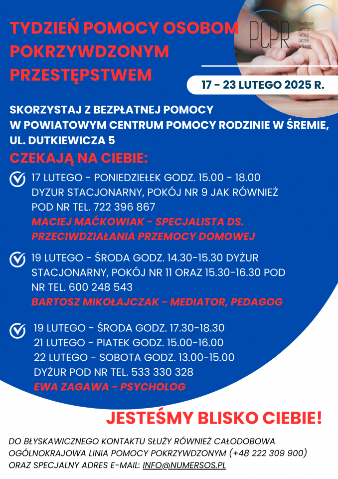 Powiatowe Centrum Pomocy Rodzinie w Śremie zachęca do skorzystania z bezpłatnego poradnictwa w ramach trwającego w dniach 17-23 lutego 2025 r. Tygodnia Pomocy Osobom Pokrzywdzonym Przestępstwem.
