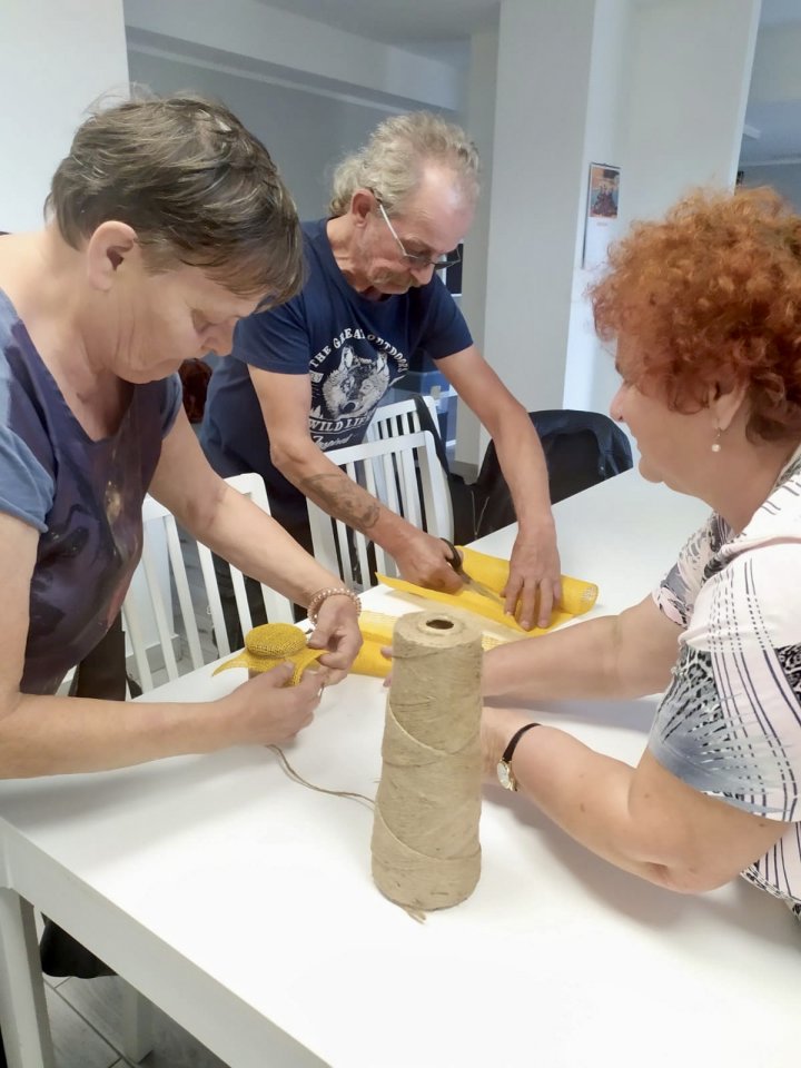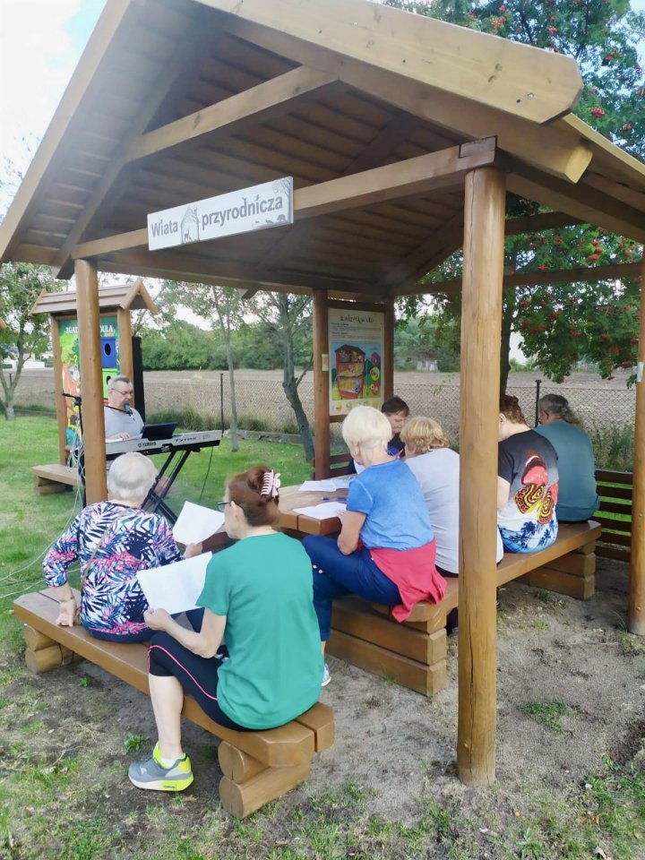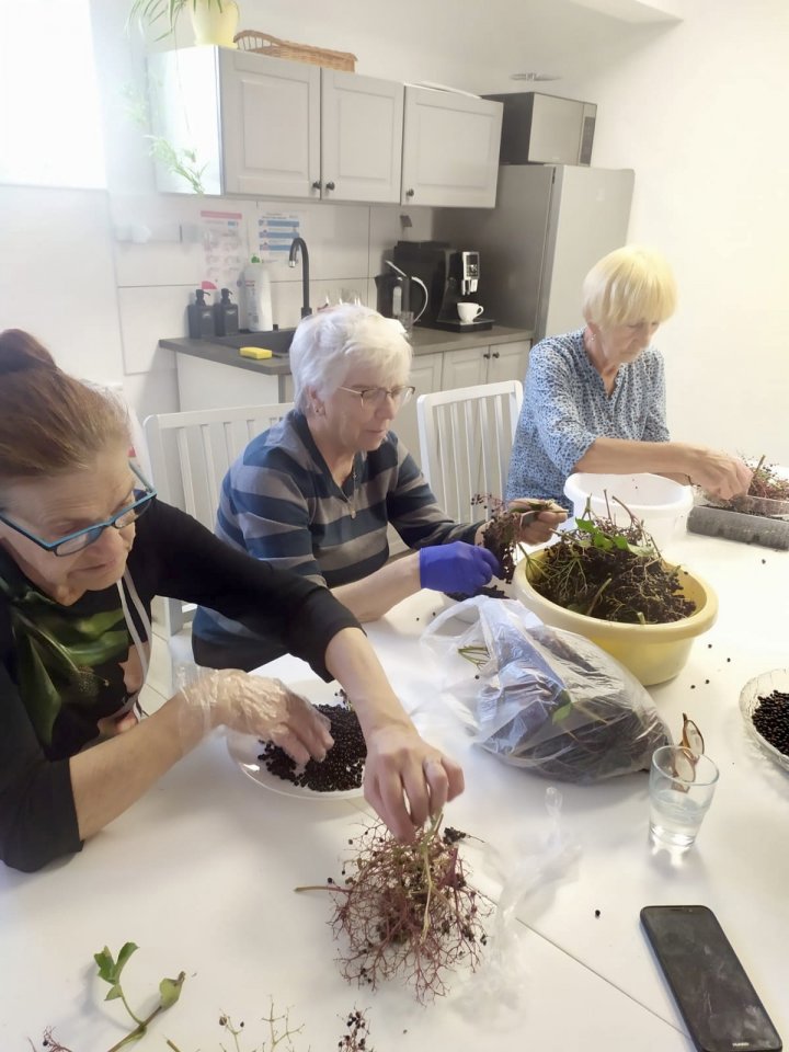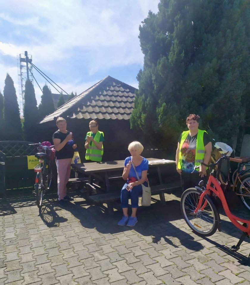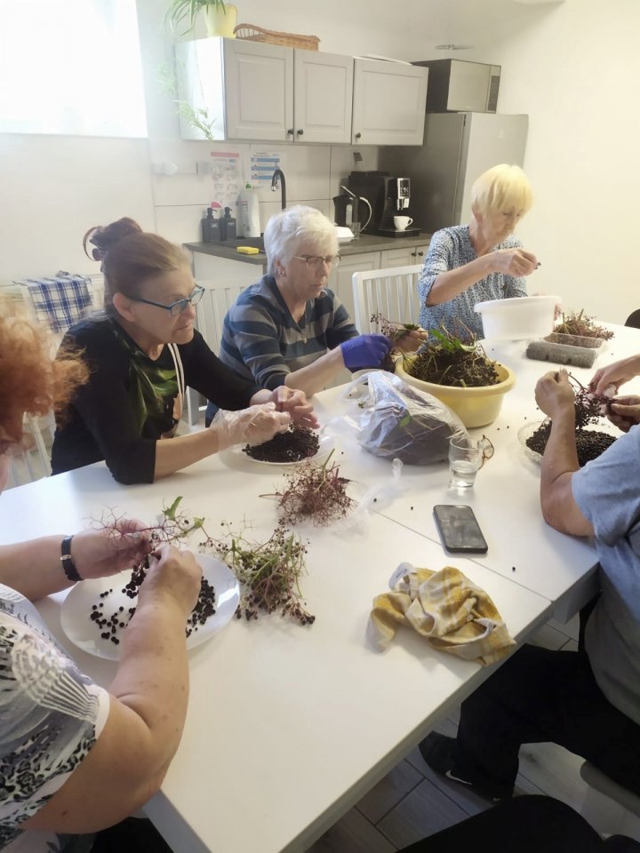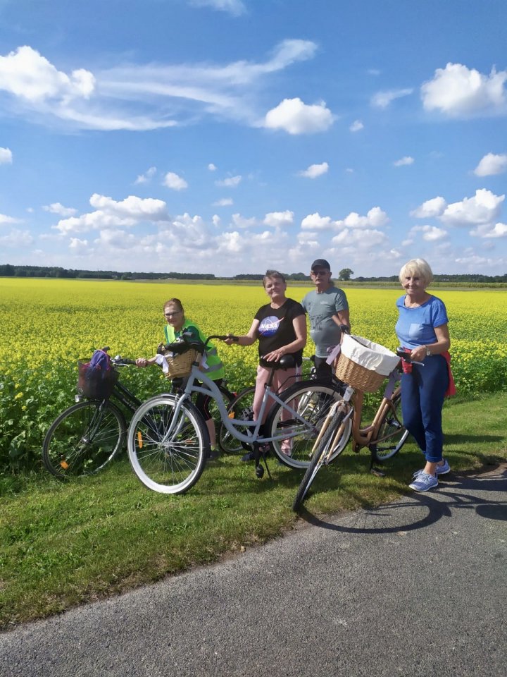 Wrzesień rozpoczęliśmy przygotowaniem do dożynek powiatowych w Księginkach, podczas których klubowicze zaprezentowali swoje rękodzieło. Dnia 6 września wybraliśmy się na wycieczkę rowerową do Świączynia, podczas której wypatrywaliśmy pierwszych grzybów, podziwialiśmy piękno przyrody i odpoczywaliśmy na przystani nad Wartą w Gogolewie. Dystans trasy wyniósł 14 km. 9 września również wybraliśmy się na wycieczkę rowerową, tym razem w kierunku Zaborowa, gdzie miał miejsce przystanek na lody. Dystans wyniósł 10 km. Część grupy udała się na spacer z kijkami. Po powrocie odbyło się wspólne muzykowanie na świeżym powietrzu z Panem Romanem Kosmalskim. Dnia 13 i 27 września klubowicze uczestniczyli w zajęciach aqua aerobiku na śremskim basenie. 13 września dodatkowo odbyły się zajęcia warsztatowe z obsługi smartfona oraz korzystania z aplikacji WhatsApp, celem ułatwienia członkom klubu wzajemnej komunikacji. Po odpoczynku udaliśmy się na zbiory jarzębiny, którą zaprawiliśmy na kolejnym, piątkowym spotkaniu. 16 września udaliśmy się na spacer, żeby zebrać owoce czarnego bzu, celem wykonania soków wspierających odporność. 30 września członkowie klubu świętowali Międzynarodowy Dzień Osób Starszych podczas seansu filmowego w Kinie „Echo” w Jarocinie oraz przy wspólnej kawie w Kawiarni Kinowej. Wyjazd został zrealizowany w ramach projektu dofinansowanego ze środków PFRON.