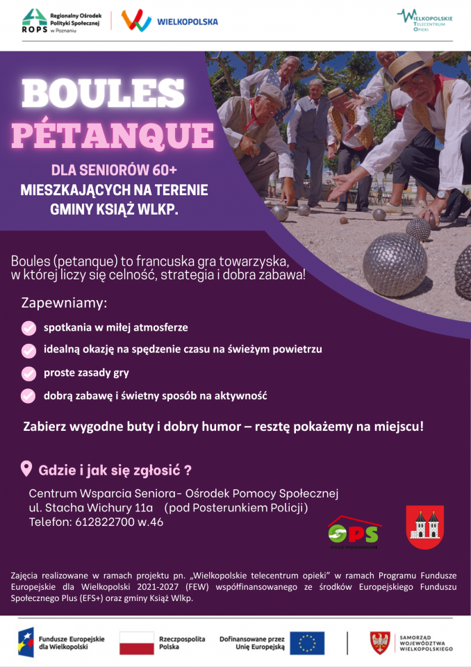 Zapraszamy do wzięcia udziału w grze Boules, zapisy w Centrum Wsparcia Seniora w Książu Wlkp. lub pod numerem telefonu 61 28 22 700 w.46